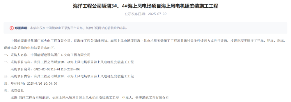 7月2日,中國能建電子采購平臺發(fā)布《海洋工程公司嵊泗3#、4#海上風(fēng)電場項目海上風(fēng)電機組安裝施工工程中標公示》的公告。