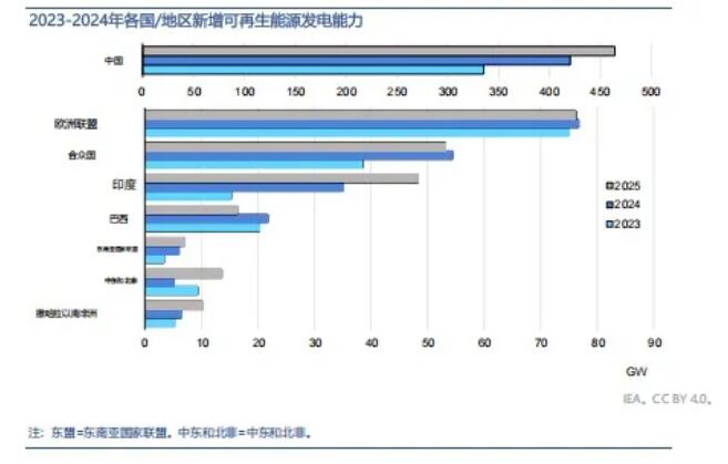 報告對全球可再生能源裝機容量增長的預(yù)測較去年略有下調(diào),主要原因是美國和中國的政策變化。美國聯(lián)邦稅收優(yōu)惠政策的提前取消以及其他監(jiān)管變化,導(dǎo)致IEA對美國市場可再生能源的增長預(yù)期較去年的預(yù)測降低了近50%。中國從固定電價轉(zhuǎn)向拍賣電價的轉(zhuǎn)變正在影響項目經(jīng)濟效益,導(dǎo)致報告下調(diào)了對中國市場可再生能源增長的預(yù)測。