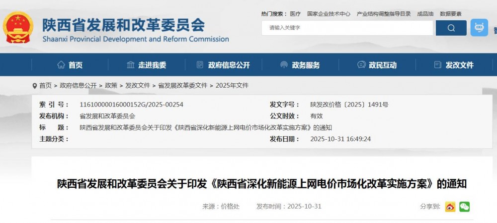 10月31日,陜西省發(fā)改委發(fā)布《陜西省深化新能源上網電價市場化改革實施方案》、《陜西省增量新能源項目機制電價競價細則》。