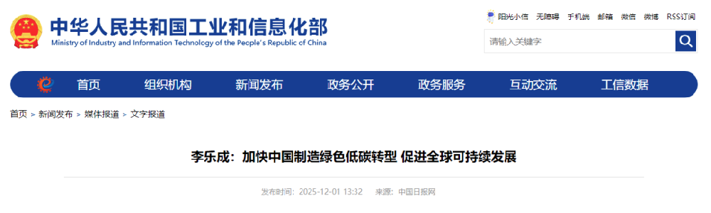 2025年12月1日,《中國(guó)日?qǐng)?bào)》刊發(fā)工業(yè)和信息化部黨組書記、部長(zhǎng)李樂成署名文章,題為《加快中國(guó)制造綠色低碳轉(zhuǎn)型促進(jìn)全球可持續(xù)發(fā)展》。文章指出,加強(qiáng)綠色產(chǎn)業(yè)國(guó)際合作。中國(guó)制造將秉持共商共建原則,利用好雙邊和多邊國(guó)際合作機(jī)制,深化綠色技術(shù)、綠色裝備、綠色貿(mào)易、綠色標(biāo)準(zhǔn)等方面交流合作。鼓勵(lì)中國(guó)光伏、風(fēng)電、鋰電池、新能源汽車等優(yōu)勢(shì)企業(yè)“走出去”,在“一帶一路”等國(guó)家投資建設(shè)綠色能源項(xiàng)目,推廣綠色基礎(chǔ)設(shè)施和交通解決方案。積極參與綠色低碳國(guó)際規(guī)則制定,加強(qiáng)國(guó)際公約履約能力建設(shè)。